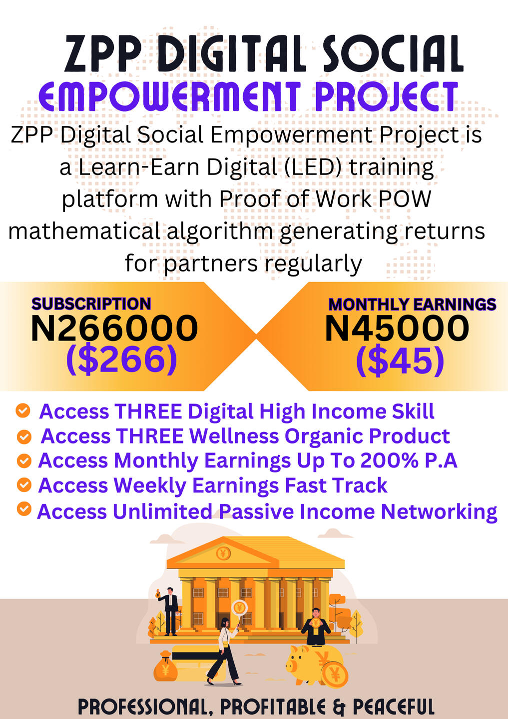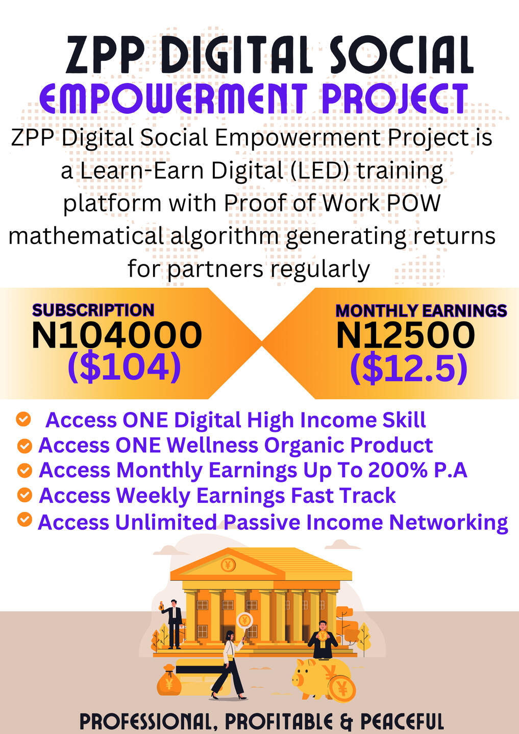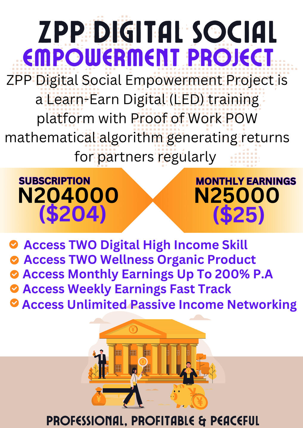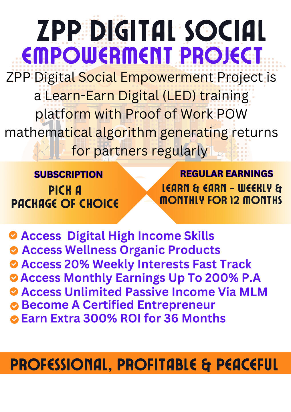 ZPP DIGITAL SOCIAL EMPOWERMENT PROJECT is a platform that will help you generate regular (weekly/monthly) income to help you achieve some of your financial goals. It's safe, stress-free and rewardingly sustainable